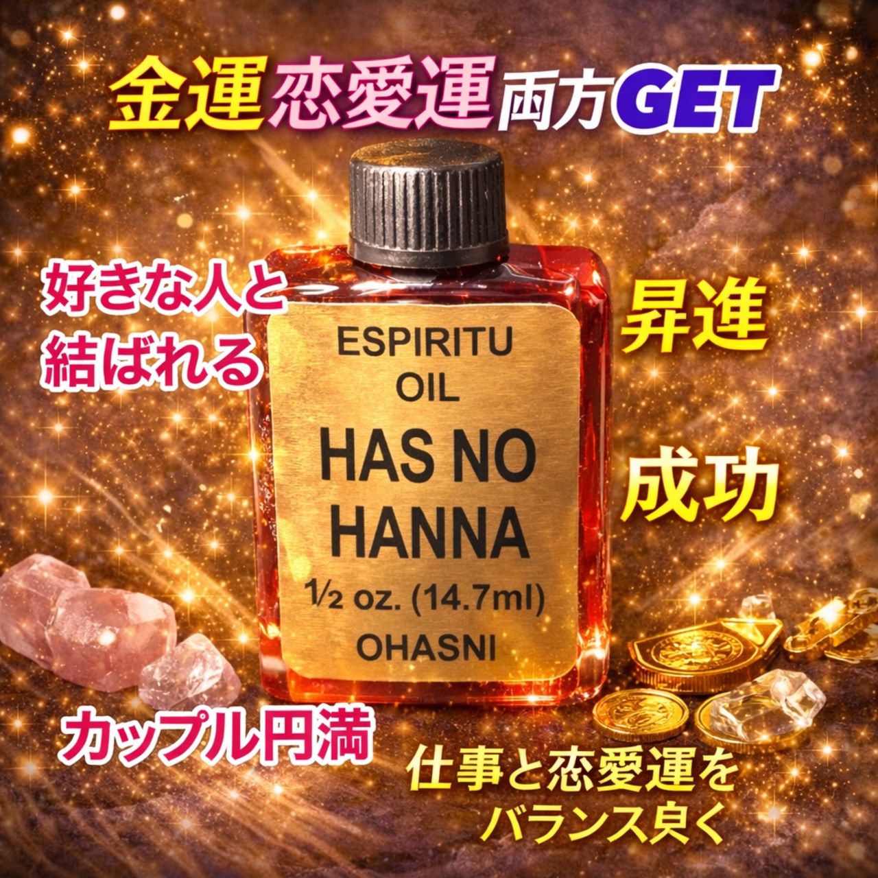 効能:新しくビジネスを始める方、独立・開業を行う方に大変おすすめなオイルです。新しいビジネスを成功に導くとともに、あなたの財産やあなた自身を他者から守ってくれます。